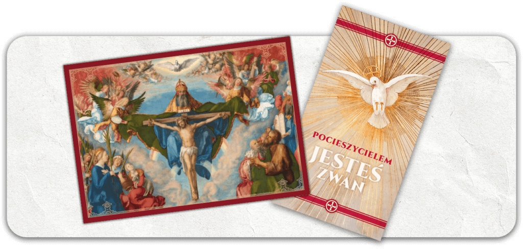 – ciekawą, napisaną przystępnym językiem, książeczkę z informacjami o tym, kim jest Duch Święty, jakie są Jego dary, owoce i charyzmaty, a także zbiór modlitw do prywatnego odmawiania; – piękny, poświęcony przez kapłana obrazek przedstawiający Trójcę Świętą. Na jego odwrocie umieściliśmy „Akt poświęcenia się Duchowi Świętemu”, za sprawą którego otworzysz się na Jego moc i działanie w swoim życiu;